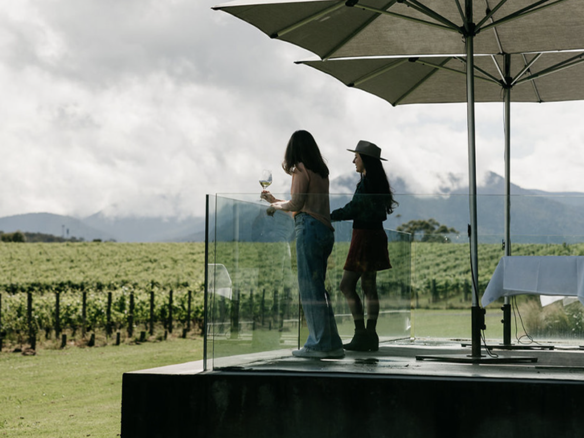 Huberts offers a more intimate scale than the valley’s larger estates, with a covered courtyard flanked by the original 1860s homestead and a modern events space. The courtyard seats 80 guests under a permanent steel-and-glass canopy with open sides, giving you weather protection without surrendering the outdoor atmosphere.